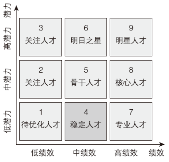 在企业中另一种经常使用的九宫格是使用绩效和潜力这两个维度的,它适用于企业的业绩比较稳定且人员的整体能力水平都不错的情况,盘点着眼于未来,目标是为了发现高潜人才。这种九宫格也被广泛使用,我们称为“高潜九宫格”。