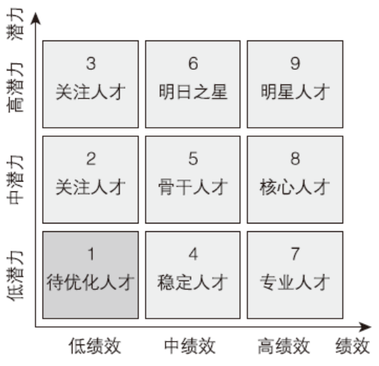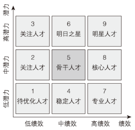图1即为经典九宫格的示意图,绩效和能力被设置成为九宫格的横纵轴。