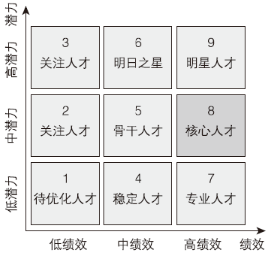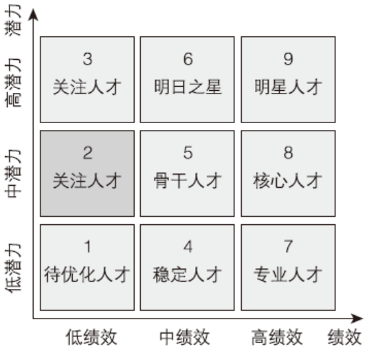 图2为由绩效和潜力两个维度组成的九宫格示意图,绩效和潜力分别设置为矩阵的横纵坐标轴,纵坐标轴的潜力指未来的发展速度。与人岗匹配九宫格不同,高潜九宫格盘点的是高潜人才,特别适合基于未来的变化的人才盘点项目,用于了解未来的人才供应情况。